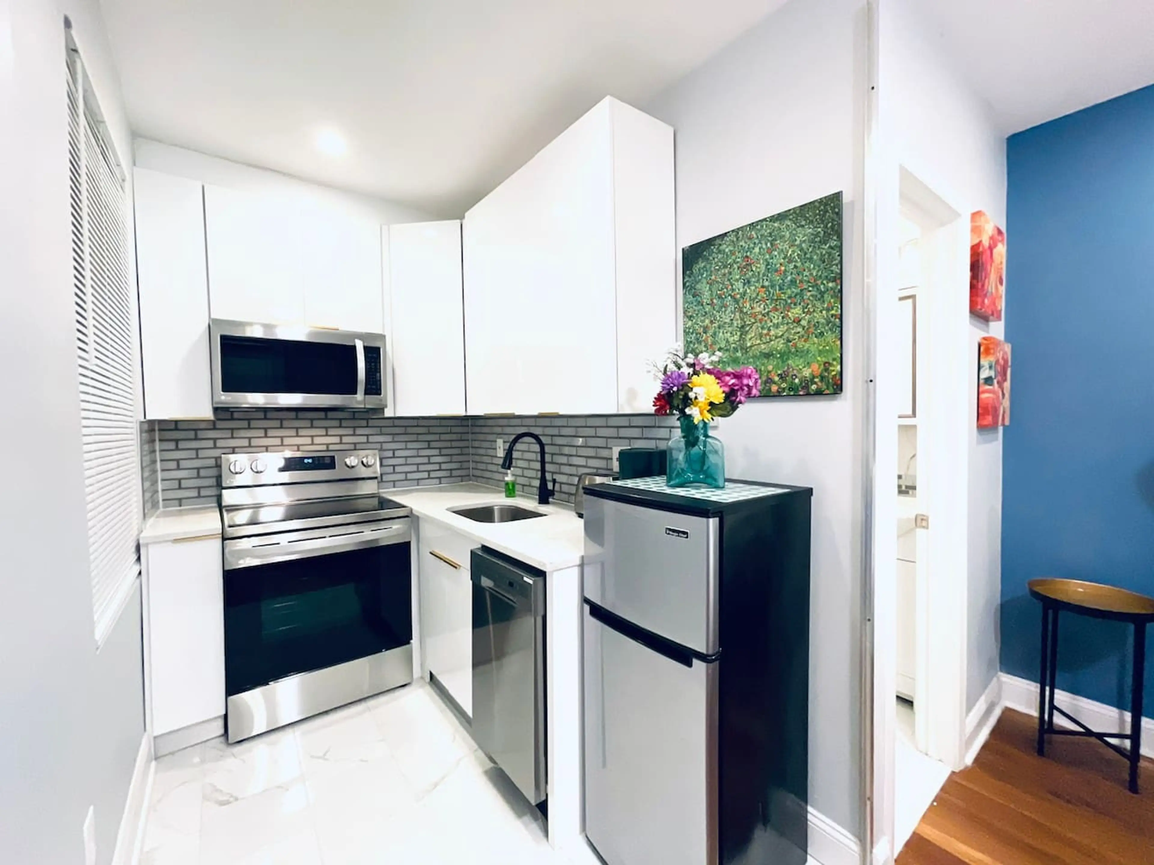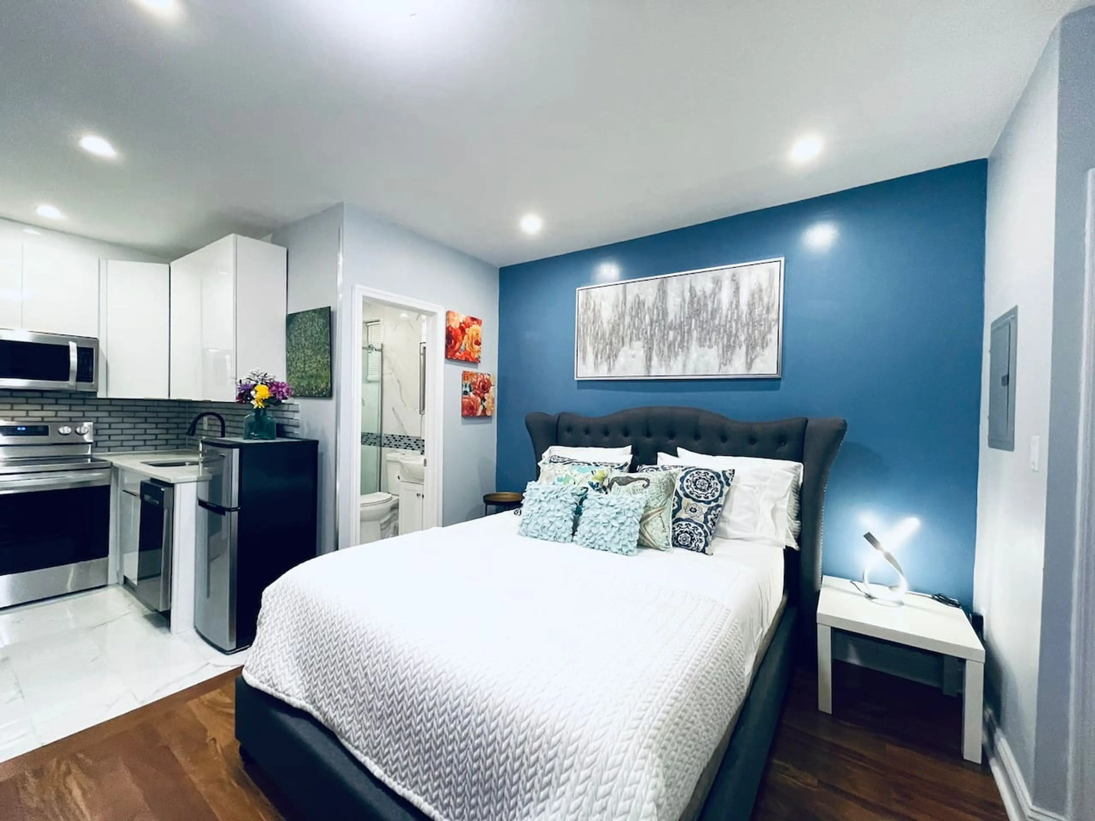 High-end brand new apartment for Airbnb with keyless check-in! This is a one-bedroom studio with a closet, two front windows with natural light, and a high ceiling. Key Property Features: - Memory Foam Mattress - Queen - High-End Massage Shower Tower - Kitchen with Basic Necessities - Smart TV - W...